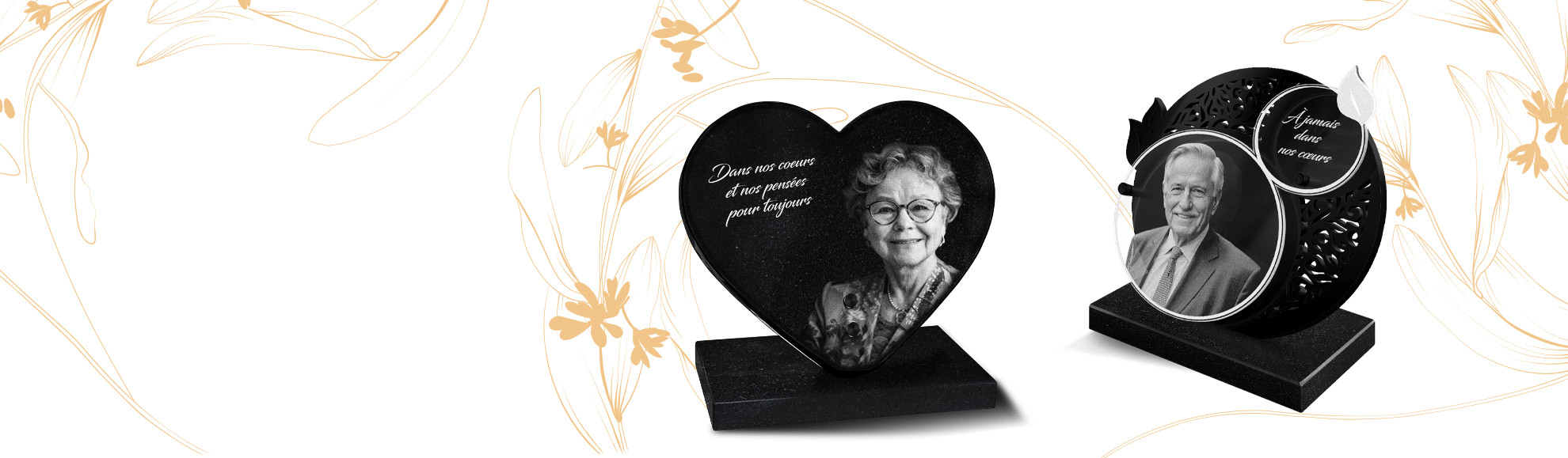 Découvrez notre catalogue de modèles sur différents thèmes prêts à être personnalisés avec la photo et le texte de votre choix. Vous trouverez également une variété de pictogrammes disponibles, pour pousser la personnalisation un peu plus loin et créer une plaque funéraire unique pour honorer la mémoire de votre être cher.