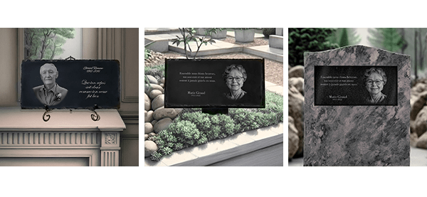 Gravée avec soin et précision, nos plaques personnalisées avec photo, en ardoise ou en granit sont d’une épaisseur respective de 7 et 10 millimètres, offrant une résistance exceptionnelle et une longévité assurée.